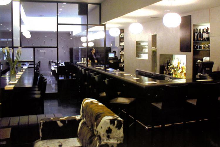 The under-lit bar and dining table or solid walnut penetrate the wood and glass wall, creating the...