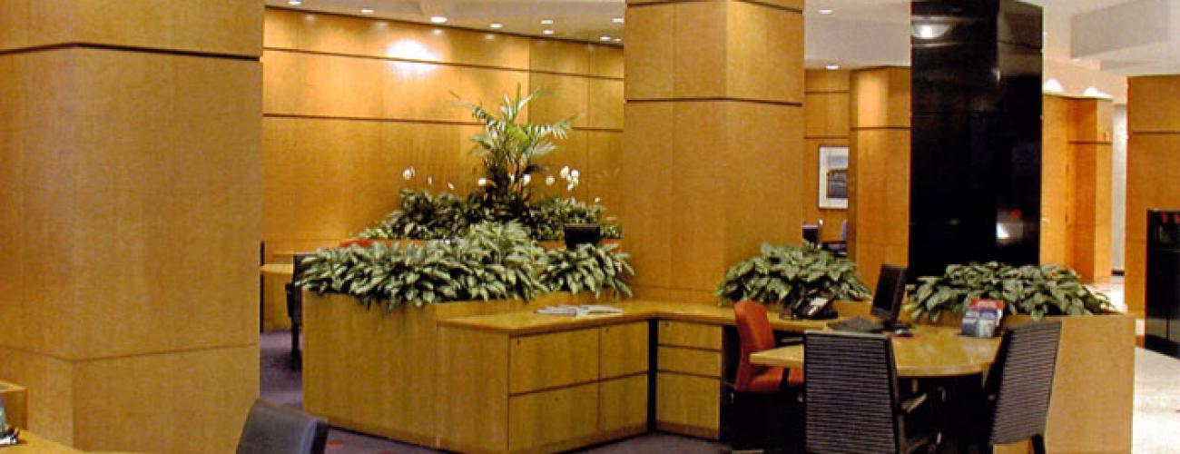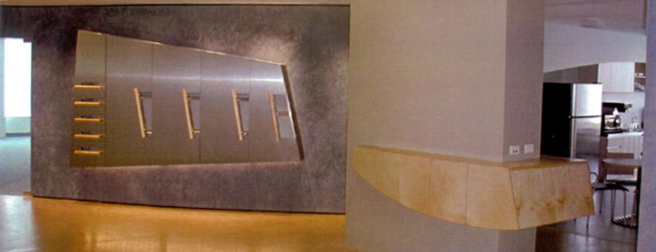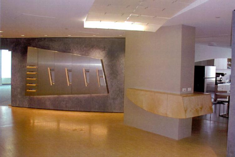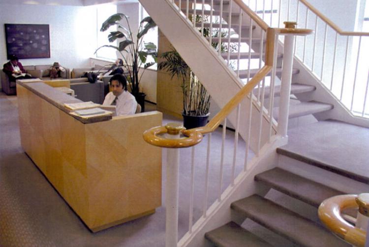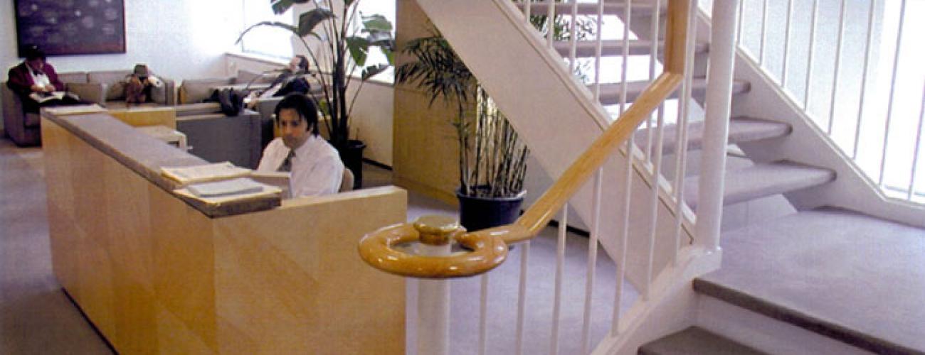 This law office features solid ash handrails curving around the steel and brass posts of the stair....